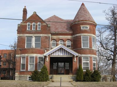 Samuel Hannaford designed this residence in 1888 on former Lane Theological Seminary grounds, incorporating both Queen Anne and Romanesque Revival architectural elements.