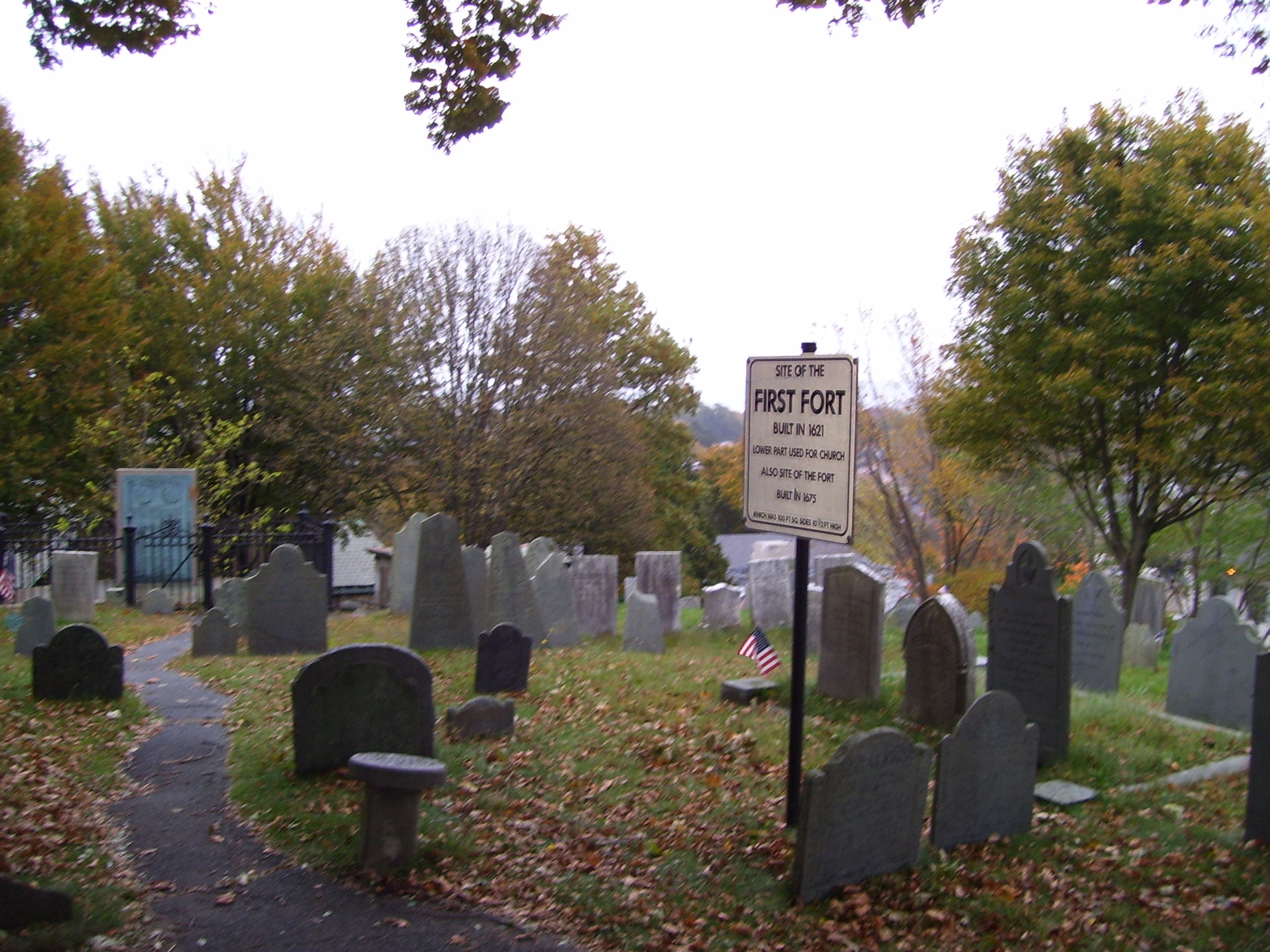 The cemetery holds gravestones of notable Pilgrims, including William Bradford, William Brewster, and John Howland, documenting early American settlement patterns.