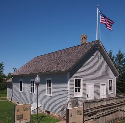 The wooden frame schoolhouse stands with separate entrances for boys and girls, featuring a gable roof and horizontal lap siding on limestone foundations.