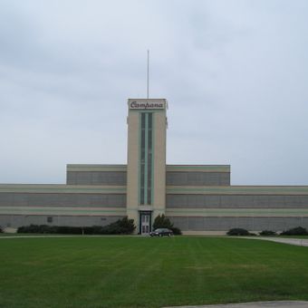 Campana Factory is a factory building in Illinois featuring Streamline Moderne architecture. The structure displays the style's signature curved lines and smooth surfaces typical of early 20th-century industrial design.