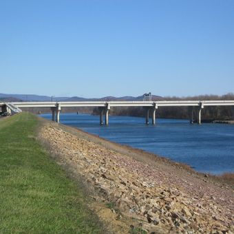 The bridge spans 2 sections across the West Branch Susquehanna River, connecting Williamsport and South Williamsport with pedestrian walkways on both sides.