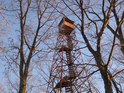 The Tick Ridge Fire Tower, constructed in 1935, stands as one of the few remaining fire observation structures in West Virginia.