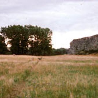 Camp Disappointment is a historic campsite in northern Montana, set in open meadows along Cut Bank Creek and framed by cottonwood trees. Behind the flat ground, a cliff of around 90 meters rises above the surrounding plain, making the spot easy to identify in the open landscape.