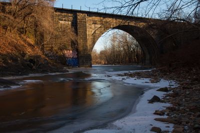 The Carrollton Viaduct is a stone railway bridge that crosses Gwynns Falls in southwest Baltimore and remains an active part of the rail network. Its design features a large central arch that distributes weight across the water below.