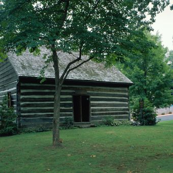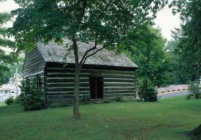 The Catawissa Friends Meetinghouse features a one-story log structure measuring 30 feet by 27 feet, constructed with hand-hewn logs resting on a stone foundation.