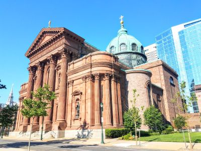 The Cathedral Basilica of Saints Peter and Paul is a Roman Catholic cathedral located on Logan Square in central Philadelphia. Its brownstone walls rise beneath a copper-clad dome, and the facade shows windows placed well above ground level along the street-facing sides.