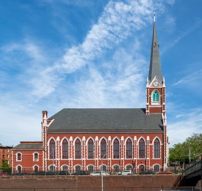 The Church of the Sacred Hearts of Jesus and Mary is a Roman Catholic building with Gothic Revival architecture and Carrara marble details. Statues of various saints adorn the interior, shaping how the space feels when you walk through it.