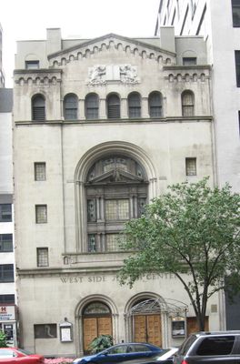 Congregation Beth Israel West Side Jewish Center is a three-story synagogue in Neoclassical style featuring columns and symmetrical design elements on West 34th Street. The building displays classical proportions and architectural details characteristic of early-20th-century religious structures.