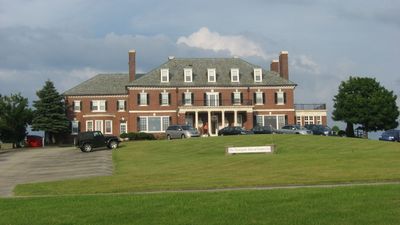 The three-story brick mansion features a five-bay central section with a hipped roof and asymmetrical wings designed by Philadelphia architect Horace Trumbauer.