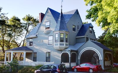 The interior maintains original woodwork from its construction period, while the exterior features a shingled porte-cochere with a rounded opening and decorative corbel details.