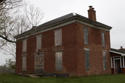 The two-story red brick residence features a three-bay wooden porch across its front and maintains its original architectural elements from 1840.