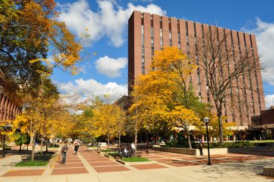 The ten-story structure features extensive glass walls on its southwest corner and contains multiple lecture halls in its lower section.