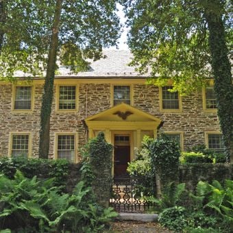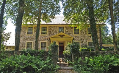 The Eagle's Nest features a large fieldstone structure with a two-and-a-half-story Georgian section connected to two long one-and-a-half-story wings.