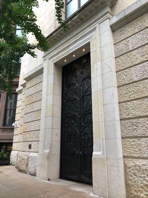 The Edmond J. Safra Synagogue features Beaux-Arts architecture with Jerusalem stone walls and large bronze doors displaying a Tree of Life design pattern.