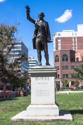 The statue honors Edmund Burke, a British parliamentarian who defended American colonial rights and opposed taxation without representation during the Revolutionary period.