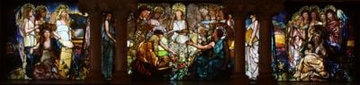 The Education window exhibits patterns created through segments of colored glass joined by lead strips, illuminating interior spaces of Yale University.