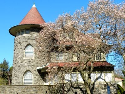 The Edward B. Seymour House features a rounded corner tower with a conical roof and exterior walls constructed of Wissahickon schist and shingles.