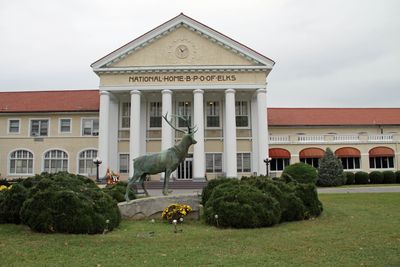 The Elks National Home spans 100 acres and includes twenty-three buildings, three sites, one structure, and two objects in Colonial Revival style.