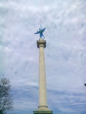 The 110-foot granite monument features a central spire topped with a bronze winged figure and two side shafts crowned with bronze eagles.
