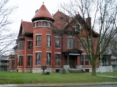 The Fairchild Mansion features three stories of brick construction with a prominent turret, gables, and a pedimented entrance porch in Queen Anne style.
