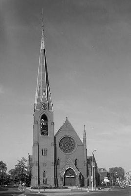 The First Baptist Church features an L-shaped brick structure with sandstone trim, terra cotta details, and a tower rising to an open belfry.
