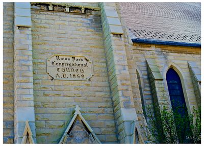 The First Baptist Congregational Church features pointed arches, stone tracery patterns, and vertical elements that extend through its entire structural design.