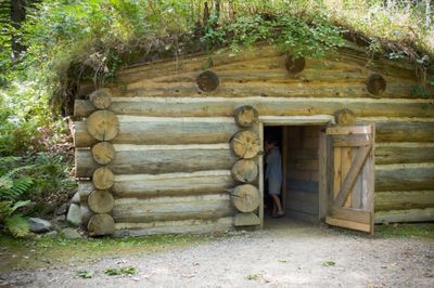 Interpreters in period clothing demonstrate traditional logging methods and share forest management knowledge at a reconstructed 1900s logging camp with bunkhouse and cookhouse.