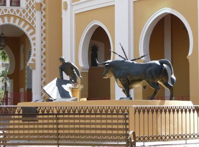 La Girondina consists of bronze statues depicting a bullfighter initiating a circular pass and a wounded bull with three stakes named Presumido.