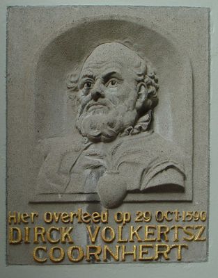 Gablestone of Dirck Volkertsz Coornhert, statue by Theo van Reijn in Gouda, Netherlands