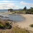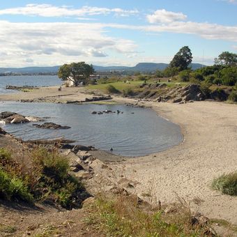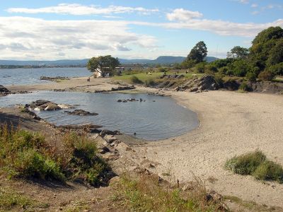 The beach extends along the Bygdøy peninsula, featuring sand areas and smooth rocks that slope gently into the Oslofjord waters.