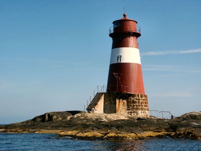 The cast iron tower stands 17.2 meters tall on a small rocky outcrop, serving as a navigation aid at the entrance of Oksefjorden.