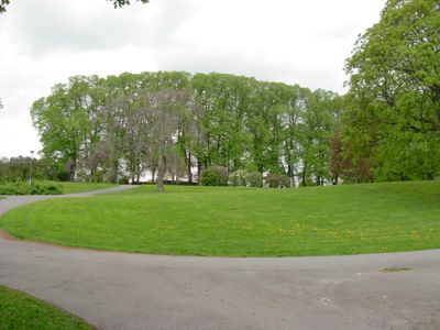The park spans 34 decares and contains a linden alley running north-south along its highest point, with Ormehaugen hill providing overview of the grounds.