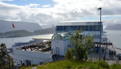 The Fjellstua building sits at the summit of Mount Aksla, offering views of Ålesund, the Sunnmøre Alps, and surrounding fjords from its terrace.