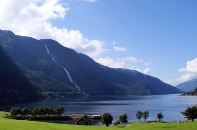 The Langfoss waterfall cascades directly into the fjord, allowing visitors to experience its 612-meter drop from both the road and hiking trails.