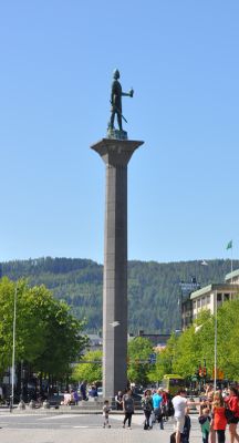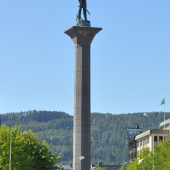 The 18-meter-tall monument features King Olav Tryggvason standing on a decorative obelisk, holding a sword and a royal orb at the city center.