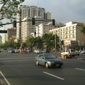 Malate extends along the southern shore of Manila Bay, forming a central area with numerous hotels, embassies, and residential buildings.