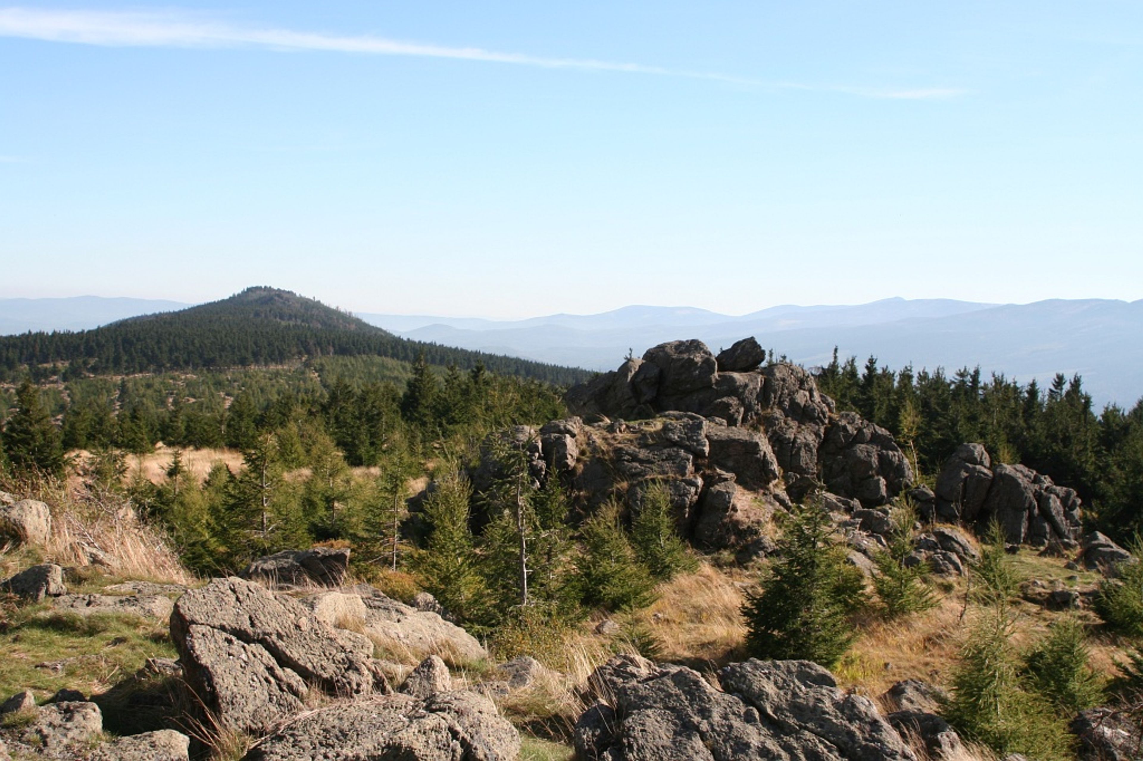 The granite peak of Wysoki Kamień rises to 1058 meters above sea level, featuring exposed rock formations and offering views across multiple mountain ranges.