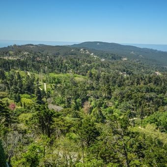 Parque da Pena is a large forested park surrounding the Pena Palace on the hills of Sintra, Portugal. Its paths wind through dense woodland past boulders, small lakes, and viewpoints that open up over the surrounding hills and coast.
