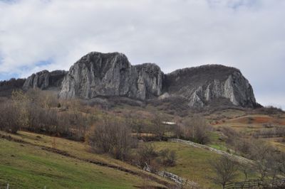 The limestone massif rises 1263 meters above sea level, featuring steep slopes and a prominent elevation difference of 500 meters from Pasul Buces point.