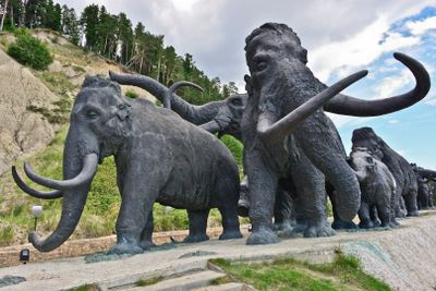 Large bronze mammoth statues stand against the winter landscape, overlooking the Irtysh River from the hills of Khanty-Mansiysk.