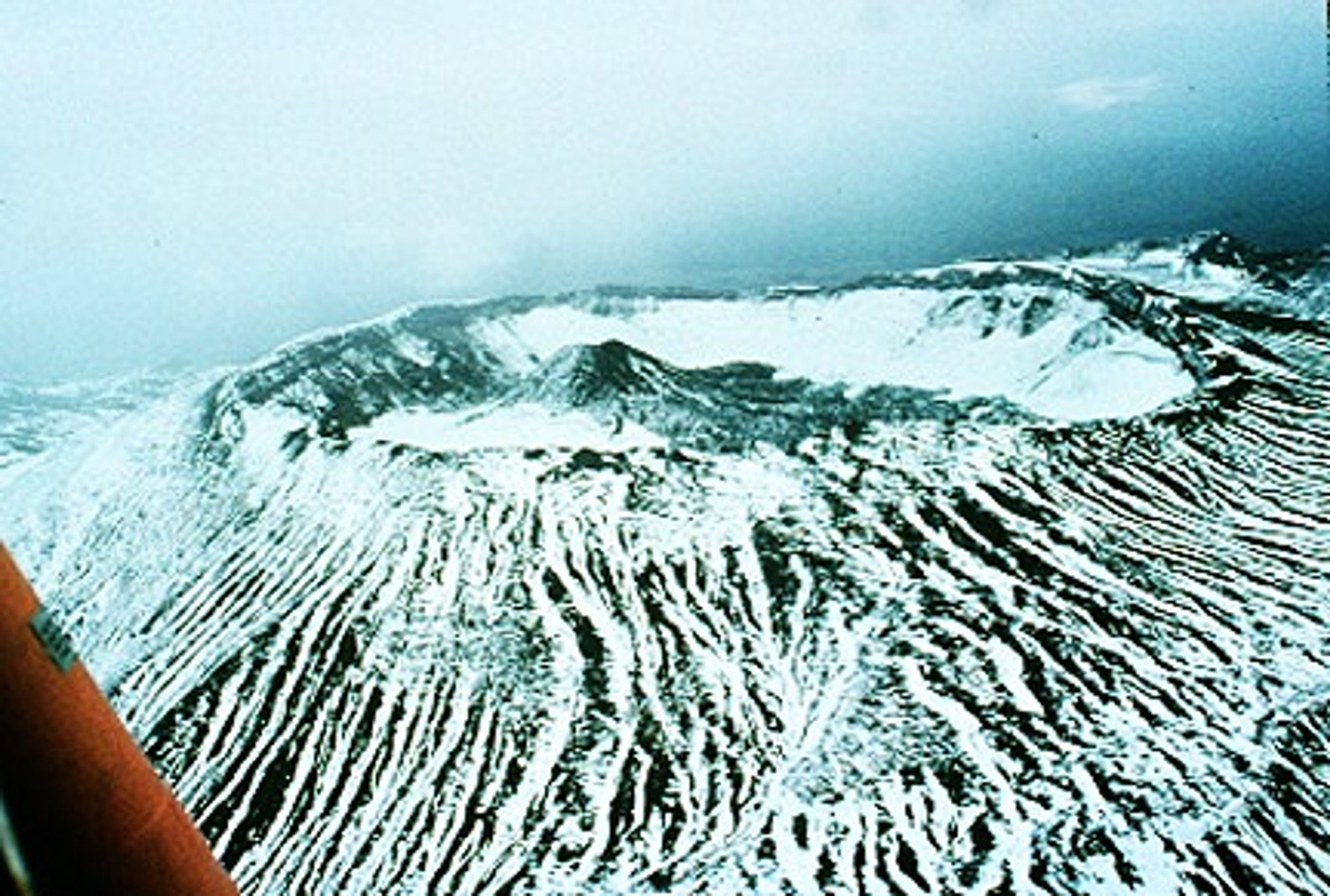 The volcano contains three cinder cones at its caldera bottom, with additional three on southeastern outer slopes and one positioned north.