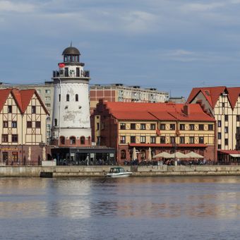 Visitors can access multiple restaurants, hotels, souvenir shops, and the lighthouse observation deck, which provides panoramic views of central Kaliningrad.