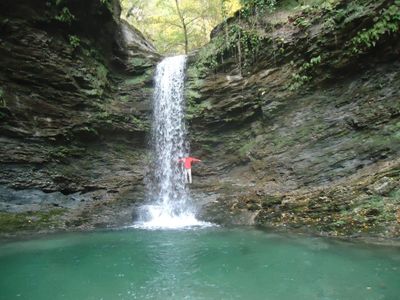 The waterfall forms part of the Azhek Ecopark, which serves as an educational center for studying the biodiversity of the Caucasus Mountains.