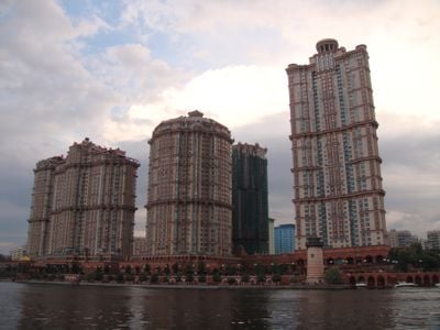 Each building within the complex exhibits different heights and architectural elements, creating a varied silhouette that stands out against Moscow's northern skyline.