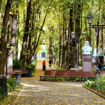 The park contains monuments dedicated to M.S. Babushkin and A.S. Pushkin along its central alley, representing important figures in Russian history and literature.