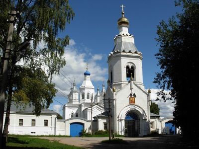The monastery complex features a bell tower and multiple church buildings that demonstrate the ecclesiastical architecture of the mid-nineteenth century Russian Orthodox style.