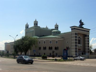 The theater building features architectural elements of Stalinist Empire style combined with decorative motifs from Buryat cultural traditions at its facade and interior.