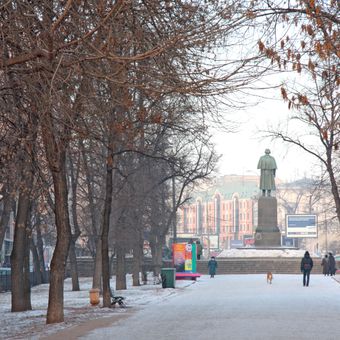 This is where Moscow's Boulevard Ring system begins, continuing onward as Nikitsky Boulevard. The location marks a key starting point for one of the city's distinctive transportation and leisure networks.