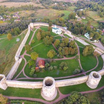 The Fortress of Izborsk sits on Zheravya Hill and consists of limestone walls punctuated by multiple defensive towers forming an integrated fortification system. The structure occupies the hilltop with fortified gateways connecting different sections of the wall.