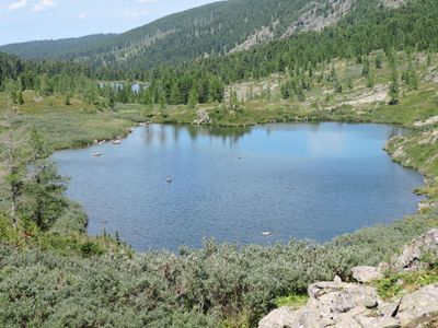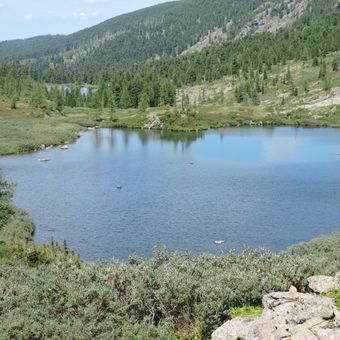 The Karakolskie Lakes form a collection of water bodies at different elevations, surrounded by dense forest and mountain slopes in the Altai region.